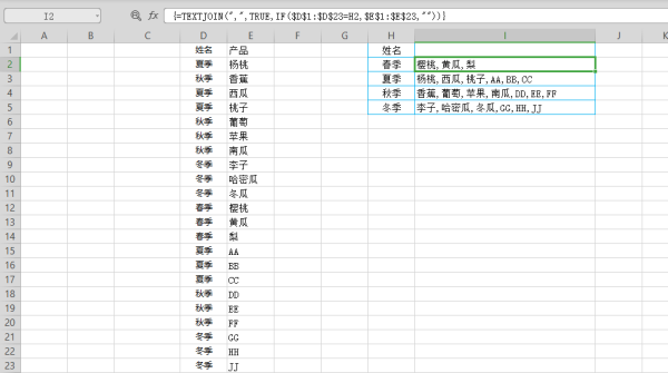 =TEXTJOIN(",",TRUE,IF($D$1:$D$23=H2,$E$1:$E$23,""))