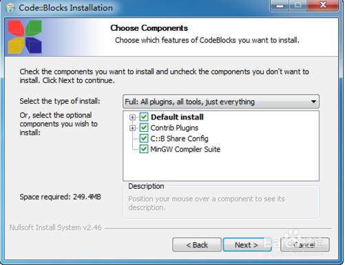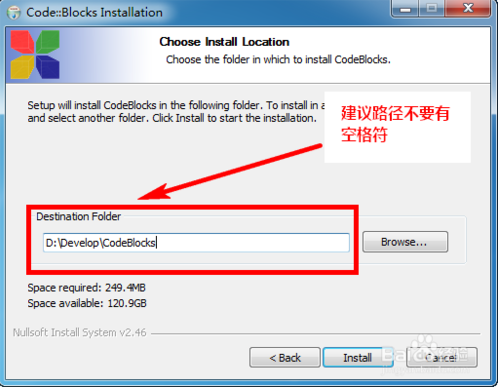 4来到这个界面选择安装路径,这里强烈建议修改下安装路径,不建议使用默认的路径,默认的路径中【Program Files】中有一个空格,以后安装一个插件可能会出问题,所以建议自己建立一个文件作为该软件的安装路径,比如这里是在D盘建立了一个Develop的文件夹,作为开发软件的安装路径,然后安装路径就选择了D:\Develop\CodeBlocks,这里可以根据自己实际情况定义。