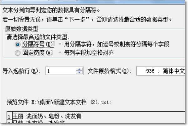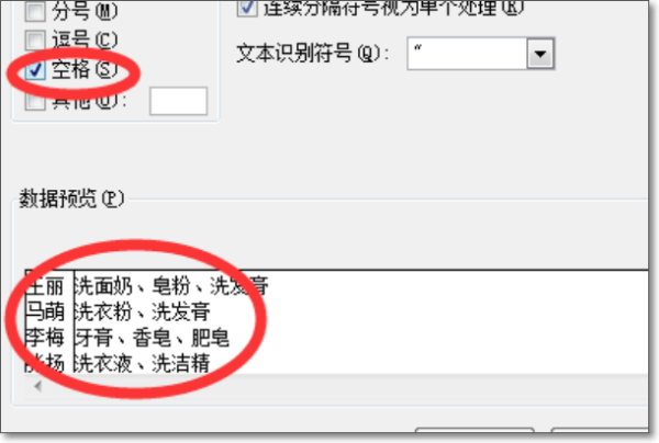 6、在这里是想要把前面的人名和后面的产品名字分割为两个单元格,故分隔符就选择为文本中显示的即空格,如下图所示,左下角还有一个数据预览,如果没问题就点击下一步。