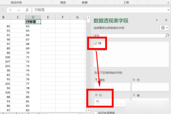 5、然后我们在右侧栏中,使用鼠标将【TE】字段拖动至【行】区域。