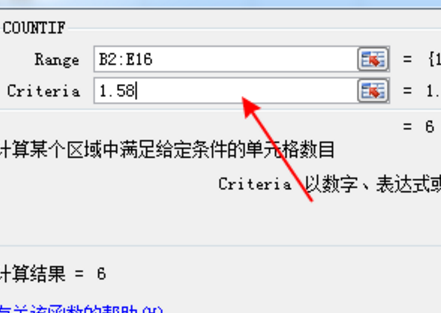 8、在criteria框中输入:1.58,因为要统计1.58出现的次数。