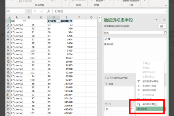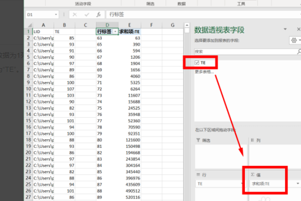 6、重复上述动作,再使用鼠标将【TE】字段拖动至【值】区域。