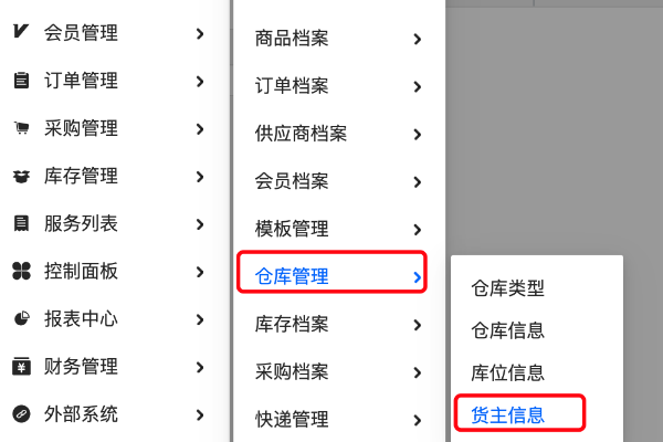 1、在管易C-ERP/百川WMS系统中,打开【基础信息】-【仓库管理】-【货主信息】页面,路径如下图。