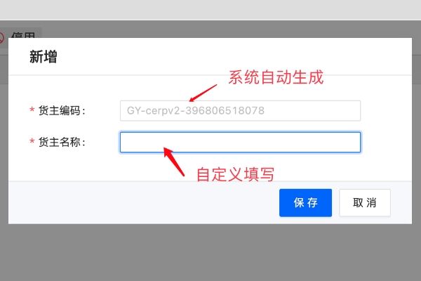 2、在【货主信息】页面中,点击“新增”,弹窗如下。货主编码系统自动生成,填写完货主名称后保存即可。
