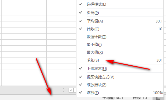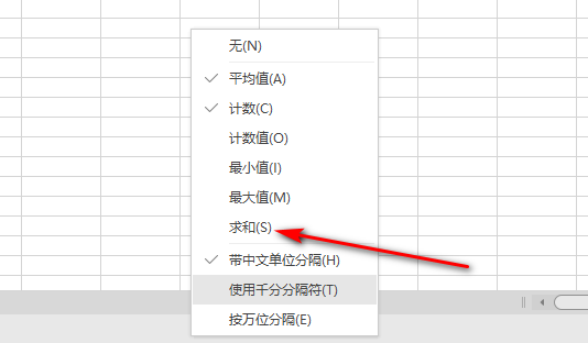 3、鼠标右键点击底部的状态栏,然后把求和勾选上,也可以勾选其他有需要的。