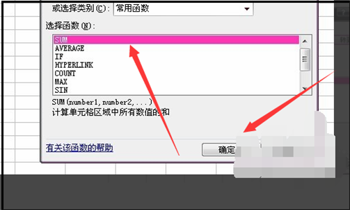 3、出现“插入函数”对话框。点击第一个函数“SUM” ,点击确定。