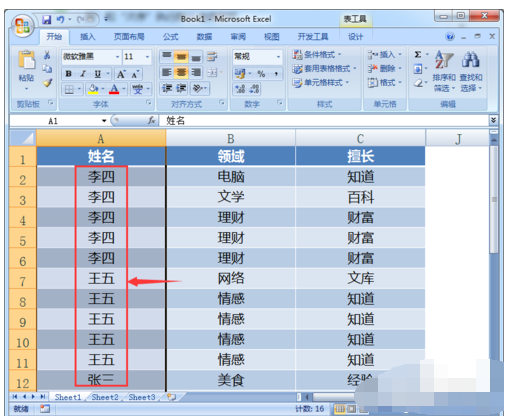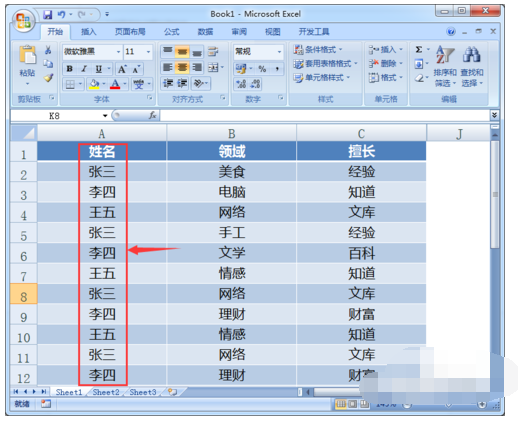 1.首先,简单描述一下问题,在如下的表格中想要把姓名一栏当中相同的人名信息排在一起。
