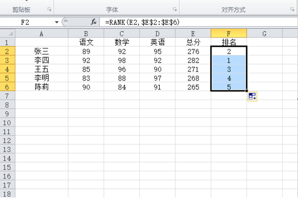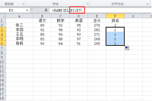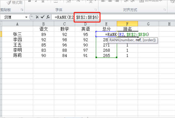 4、所以要回到F2,把排名取值范围固定,即加$符号绝对引用,则变成$E2:$E6,那么公式往下拉填充时范围就不会发生任何变化,一直都是保持E2:E6,如下图所示。