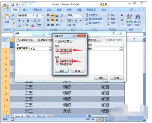 6.默认的情况下,在选择相应的数据之后,就会进行排序,在方向上是“按列排序”,在方法上是“字母排序”,再这样的规则之下,才能保证Excel中相同的信息会排列在一起。