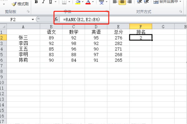 2、用RANK函数排名,在单元格F2输入RANK函数,F2=RANK(E2,E2:E6),然后按Enter回车键,会出现该同学的排名,如下图所示。