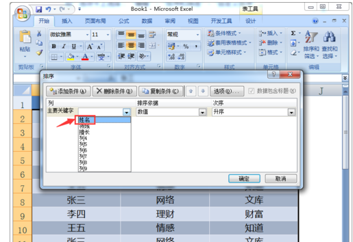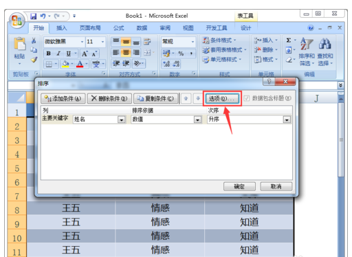 3.这时,会弹出“排序”窗口,在列的主要关键字中选择“姓名”,“排序依据”和“次序”执行默认选项即可。