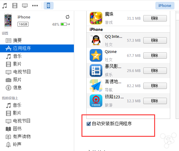 用连接手机和电脑,点击iTunes手机设备中的应用程序,然后点击右下角的自动安装新应用程序即可。