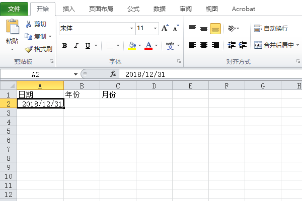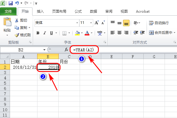 1、以excel2010版为例,如下图中要将日期“2018/12/31”提取出来年份和月份,并在B2单元格显示年份,C2单元格显示月份;