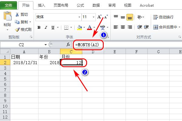 3、选中C2单元格,然后输入公式“=MONTH(A2)”后点击回车键,就可以得出月份是“12”了。