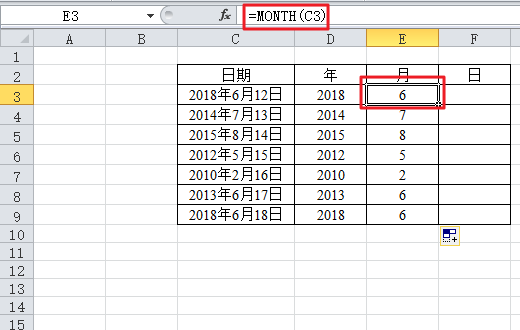 3、在“月”的单元格中输入“=Month(C3)”,再按下回车键,最后下拉单元格至最后一行,这样“月”就全都提取出来了。