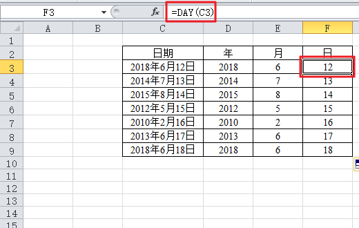 4、在“日”的单元格中输入“=Day(C3)”,再按下回车键,最后下拉单元格至最后一行,这样“日”就全都提取出来了,最后所有的年月日都被提取出来了。