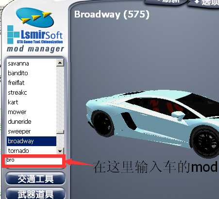 4.在输入栏输入自己安装的车的mod名称,比如我的兰博基尼broadway.dff,只要输入几个它就会自动显示出来了。记住车的代码,比如575,进入游戏之后,用刷车器刷出来就可以。如图所示。