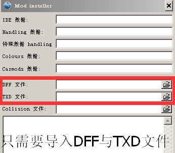 2.只需要导入DFF与TXD文件,点击旁边那个文件图标,TXD文件也是如此,比如修改的汽车是兰博基尼。如图所示。