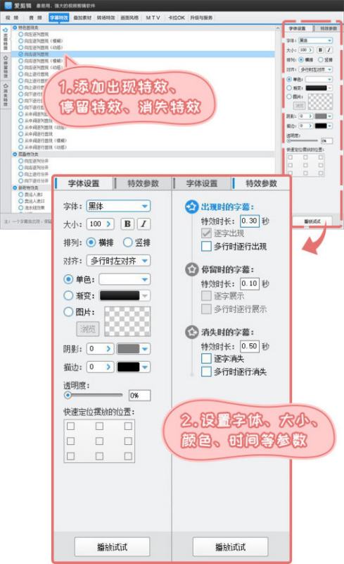 选中字幕,在左侧的特效列表中,勾选合适的字幕特效。在右侧的参数设置处,修改字体、大小、排列方式、特效时长等。