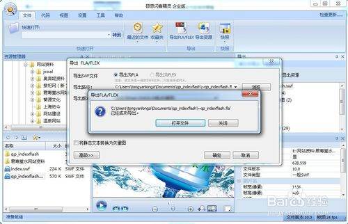 点击完成后,会提示你是否打开导出的文件,如果你的电脑上安装了flash制作软件,如图中的flash cs4,那么它就会直接打开。如果暂时不想打开编辑,可以选择关闭。