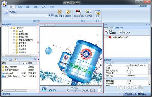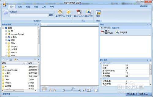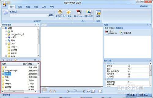 1 首先我们打开闪客精灵,闪客精灵的操作面板还是比较简单的,大家只需要了解基本常用功能就可以了。左上角是资源管理器,左下角是文件选择区域,中间是文件播放区域,右上角是导出信息面板,右下角是影片信息面板