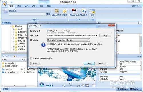 当点击 导出FLASH/FLEX 后,会弹出导出文件对话框,这里的选择很重要,导出路径不用说,就是文件导出后存放的位置,导出的版本选择,一定要尽量选择推荐版本,因为它会解析你的文件,推荐出制作时所用的版本。如果你没有当前版本,可适当选择较低版本,不过如果flash中含有as脚本,那么可能会对脚本造成影响。当然这里你也可以根据你的需要选择导出flex格式,高级设置一般不用改懂。