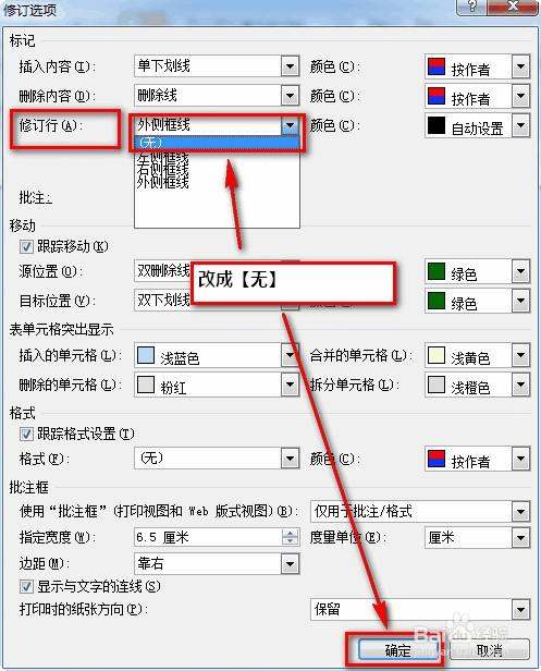 将【修订行】出的下拉菜单改成【无】,确定即可。