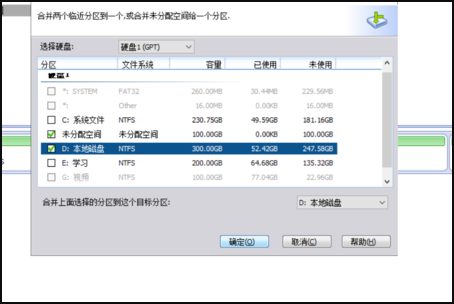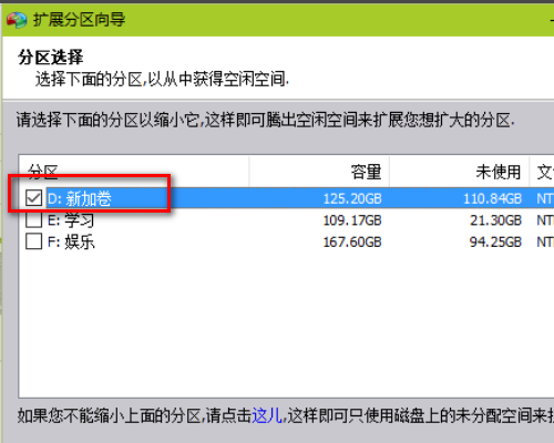 4、从列表中选中D盘,表示从D盘里划分点空间来扩展C盘。
