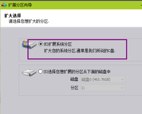 2、然后将启动扩展分区向导窗口,在这个窗口中选中“扩展系统分区”选项并点击“下一步”按钮。