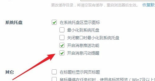 6、在右侧的系统托盘窗口设置分组中,我们点击取消“开启消息推送功能”与“开启消息闪动提醒”两个设置项前面的复选框即可,这样就不会再在右下角显示广告信息了。