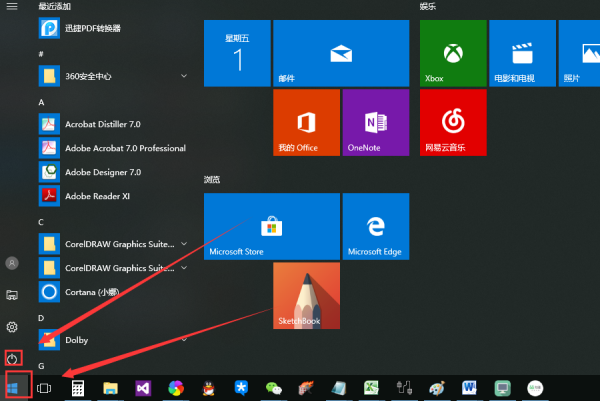 点击任务栏最左边的[开始] 图标,然后点选[电源]图标,并选取[关机]