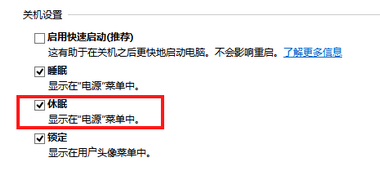 在这里把快速启动给关闭,然后点勾上休眠,这样在开始的电源按钮的二级菜单里面就有休眠的选项了。便于在关机和休眠之间选择
