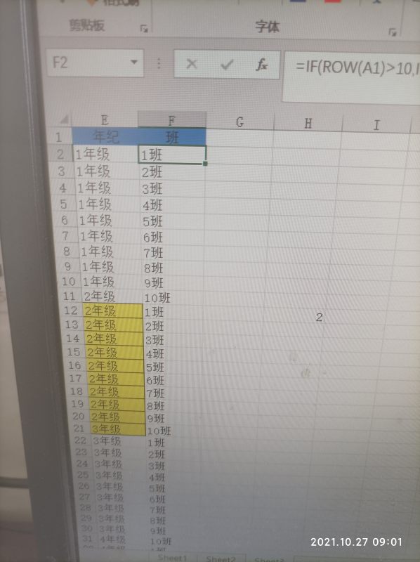 =ROUNDUP(ROW(A2)/10,0)&"年级"