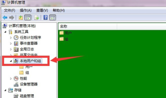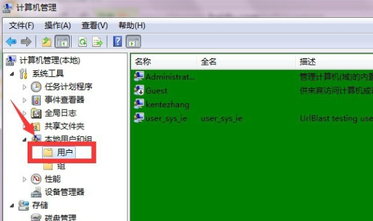 3、点击本地用户和组后,点击用户。