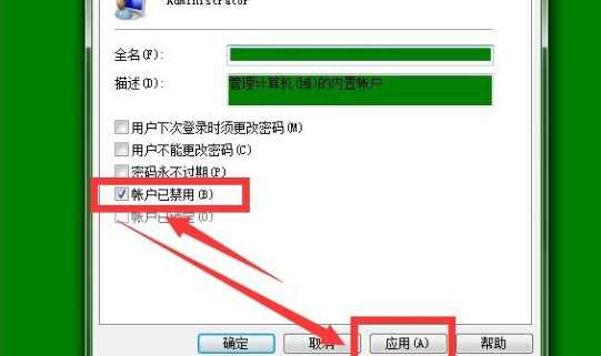 5、点击进入属性,点击账户已禁用,然后点击应用就可以隐藏这个用户了。