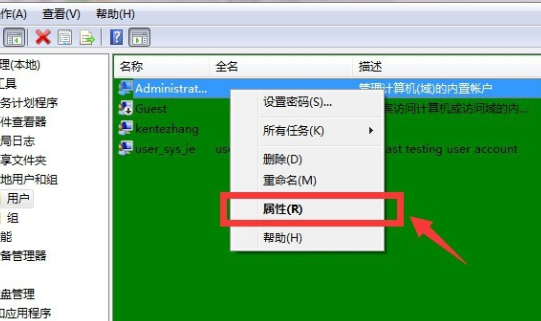 4、点击用户后,在右侧鼠标右键点击不要的用户,然后选择属性。