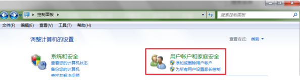 2、如果控制面板的查看方式是类别的话,则按下图方式先打开用户帐户和家庭安全。