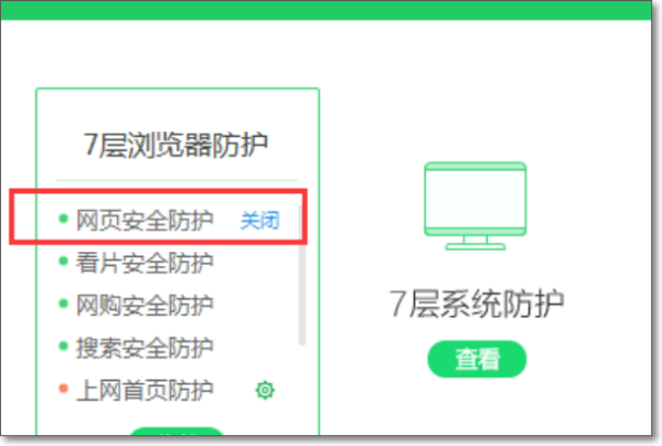 5、点击查看后,弹出的列表中,选择“网页安全防护”,点击“关闭”,