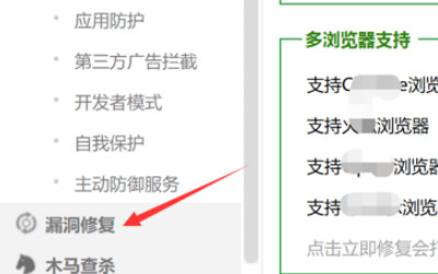 3、接着会进入安全设置页,拖动左侧列表到漏洞修复一项,打开漏洞选项,进入更改配置,进行其提示关闭。