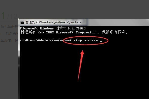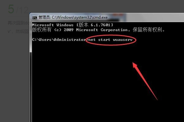5、然后再次回到管理员界面,输入”net start wuauserv“,然后回车来启动服务。