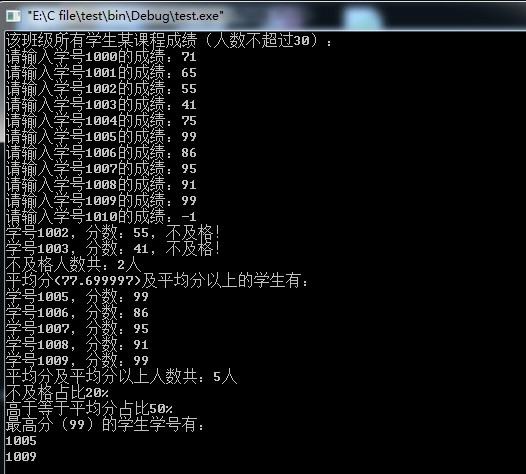for(i=0;i i=0; while(*p_slen<=MT) { printf("请输入学号%d的成绩:",sid[i]),scanf("%d",&n); if(n>FM) { printf("%d输入无效,不能大于满分上限%d\n",n,FM); continue; } if(n<0) break; ss[i++]=n; sum+=n; } *p_slen=i; return sum; } int contFStudents(int ss[],int sid[],int slen) { int i,cnt=0; for(i=0;i if(ss[i] printf("不及格人数共:%d人\n",cnt); return cnt; } int contAAvg(int ss[],int sid[],int slen,float avg) { int i,cnt=0,sum=0; if(avg==-1) { for(i=0;i avg=(sum*1.0)/slen; } for(i=0,printf("平均分(%f)及平均分以上的学生有:\n",avg);i if(ss[i]>=avg)cnt++,printf("学号%d,分数:%d\n",sid[i],ss[i]); printf("平均分及平均分以上人数共:%d人\n",cnt); return cnt; } int contMax(int ss[],int slen,int *sid) { int i,max=ss[0]; if(!sid) return 0; for(i=0;i if(ss[i]>max) max=ss[i]; for(i=0,printf("最高分(%d)的学生学号有:\n",max);i if(ss[i]==max) printf("%d\n",sid[i]); return 1; } #include #define N 10 void main() { int a[N]={45,58,62,71,77,80,88,93},n=8,i,k,b; printf("原始成绩记录为: "); for ( i=0;i k=77; for ( i=b=0;i if ( a[i]==k ) b=1; if ( b ) a[i]=a[i+1]; } if ( b ) n--; printf("删除后成绩记录为: "); for ( i=0;i k=70; for ( i=0;i a[n-i]=k; n++; printf("插入后成绩记录为: "); for ( i=0;i } 相关文章 初学STM32的入门方法有哪些?我的一些体会:\x0d\x0a\x0d\x0a首先,关于STM32入门,这个可能需要的是指导教程和技术论文。说实话STM32并不难,因为你可以把它当做单片机来用,至少不会 vc++6.0执行源文件是出现“执行CL.EXE时出错”是怎么回事?“CL.exe”是VC使用真正的编译器(编译程序),其路径在“VC根目 录 /VC98/Bin”下面,你可以到相应的路径下找到这个应用程 用vb编程要求输入一个两位数,输出:个位和十位的和OptionExplicit 数控冲床编程方法?1.分析零件图纸:任何一个零件无论怎样加工,首先应对其零件图进行分析。全面了解被加工零件的几何形状、尺寸大小、零件材料及热处理情况,为工艺处理做好准备。2 大一C语言编程题?车票根据题意两两站点连线生成,金额和数量分别用随机数。数据存储:站点,车票,用户分别为3个结构体,用于对应数据库。 Java图形用户界面编程我给你写,已经测试,你看合不合你的意思 package dongzi.pattern; import java.awt.FlowLayout; import java.awt.event.ActionEvent; import java.awt.ev 求西门子宏程序,编程实例众所周知,西门子系统的一大亮点就是包含丰富的手动测量功能及各种各样的测量循环。但本期给大家介绍一下如何简单的编写一个西门子测量宏程序,用于测试 编程教育和机器人教育有什么不一样?机器人编程的语言与计算机编程的语言略有不同。像青少年儿童机器人编程这块,乐高EV3的编程是模块化编程,非常适合零基础的孩子入门。VEX机器 谁有 VB编程与应用(电大)29讲视频教程下载,有其它的视频下载也可以VB编程与应用(电大)29讲为什么我下载的宁波电大的vb教程的视频有些打不开啊这个问题我也遇到过,其实只要求大佬们怎么用c语言输出以下内容(图一) 使用查找删除形式?
