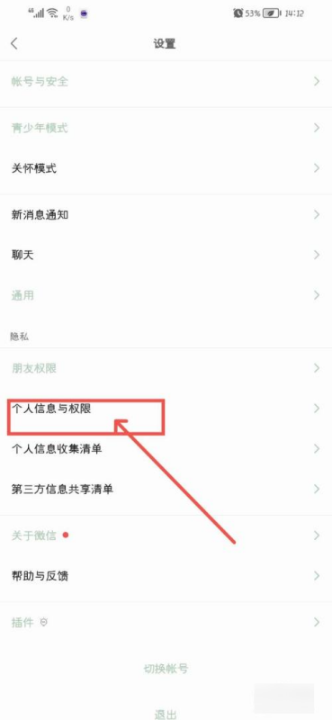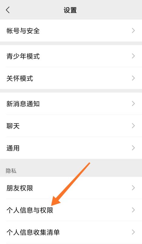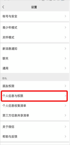 2.在设置页面找到“个人信息与权限”,点击进入。