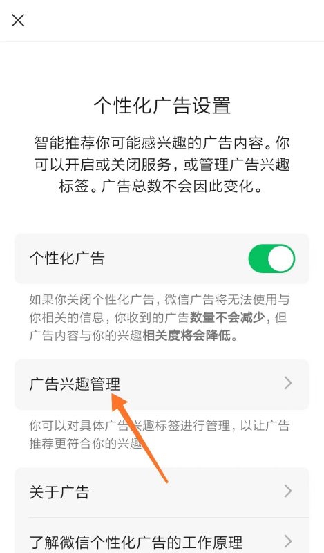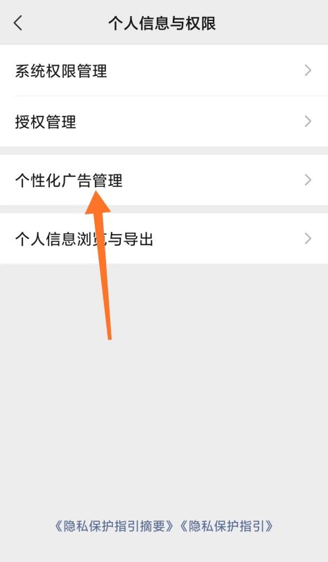 打开微信设置中个人信息与权限界面,点开个性化广告管理即可进行相关设置。