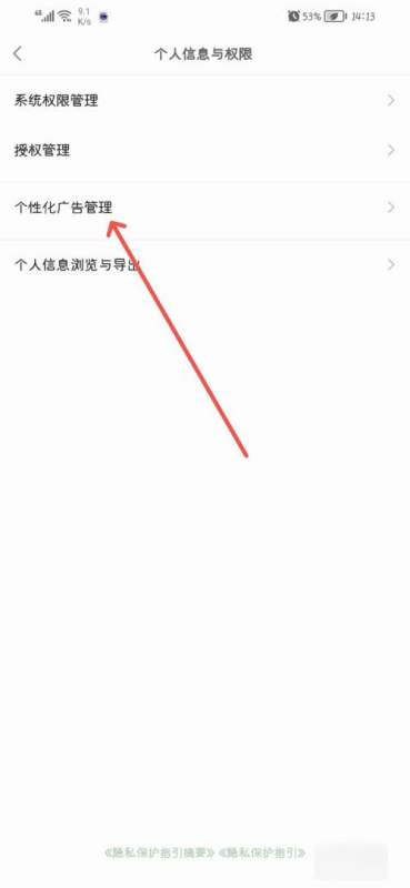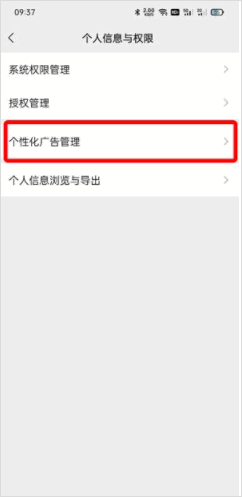3.在个人信息与权限页面找到“个性化广告管理”,然后点击进入。