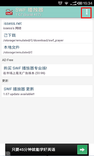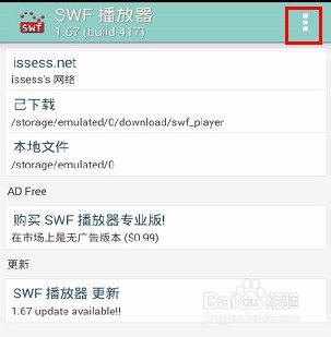 3、安装成功后,在主页面右上角有一个“三个点的”标志,点击进入设置界面在这里你可以选择SWF文件的位置,默认位置为“/sdcard ”如果你的手机支持存储卡那么就会出现Sdcard0和Sdcard1,前者表示手机储存,后者为存储卡,