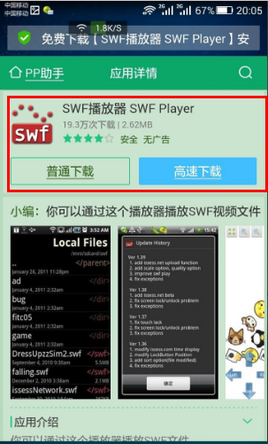 2、接着在手机的应用市场上找到并下载好如图所示的SWF播放器,该软件是用于播放本地swf文件的一个工具。