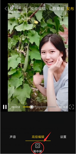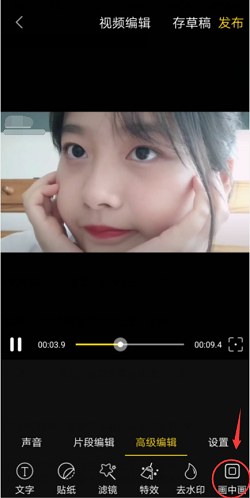 在视频编辑页面中,找到高级编辑模块的“画中画”功能,并点击进入制作画中画的下一个步骤。