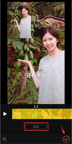 选择需要添加的视频或照片,点击即可选择完成,选择好后可以按住视频移动到需要添加的位置,按住黄色图标可以控制视频大小,设置完成后点击“√”。