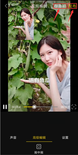返回视频编辑页面后,点击“存草稿”将视频保存至我的作品,点击“发布”即可快速分享给好友。