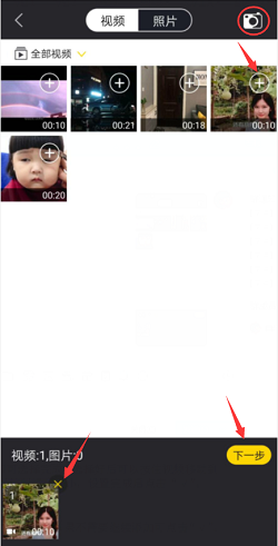 点击视频中的“+”,导入需要的视频,点击“×”导出添加错误的视频,当然也可以现场拍摄,点击台右上角的“相机”图标即可。视频添加成功后,点击“下一步”。